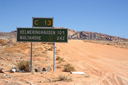 Heute geht es weiter nach Wolwedans. Wir fahren erst einmal Richtung Helmeringhausen, man sollte nicht denken das wir in Namibia sind. Auch nicht wenn wir uns umdrehen und das andere Verkehrsschild anschauen.