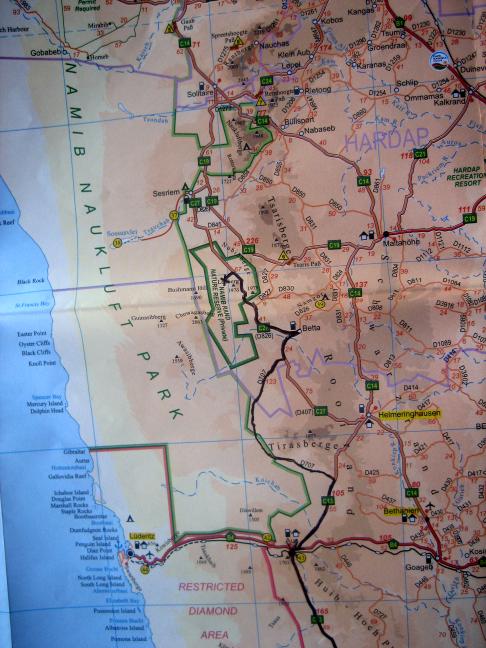Wir fahren mitten durch die Namib Wüste, eine der ältesten Wüsten der Welt. Es geht vorbei an großen Sanddünen und hohen Bergen. Ist einfach ein grandiose Landschaft. Auf dem Bild links erkennt man eine typische Pad.