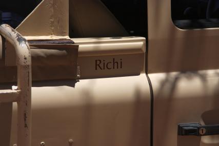 Gepäck wird in den Jeep, der den Namen Richi trägt, von Wolwerdans geladen. Zu den Unterkünften darf man nicht selber